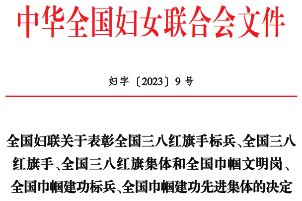 近日,中华全国妇女联合会印发《全国妇联关于表彰全国三八红旗手标兵、全国三八红旗手、全国三八红旗集体和全国巾帼文明岗、全国巾帼建功标兵、全国巾帼建功先进集体的决定》(妇字〔2023〕9号),jiuyou.com控股集团办公室行政部上榜,获评“全国巾帼文明岗”。